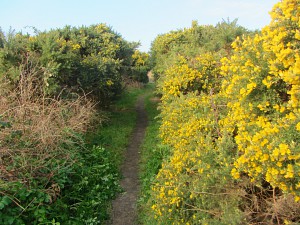 5. Once up at the top, keep a close look out for a track on your right and a sign pointing right. Once on the track you’ll immediately see a finger post. Turn right and follow this sign through the gorse.